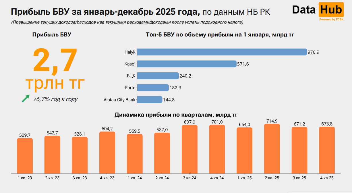 По итогам года совокупная прибыль банков составила 2,7 трлн тенге. Рост есть, но скромный – всего 6,7%, то есть банковские доходы даже не догнали инфляцию за декабрь (12,3%). При этом картина распределена крайне неравномерно: две трети всей прибыли пришлись на три крупнейших банка, а первая пятерка забрала почти 80%. Единственным банком, закончившим год в минусе, стал «новичок» BNK.