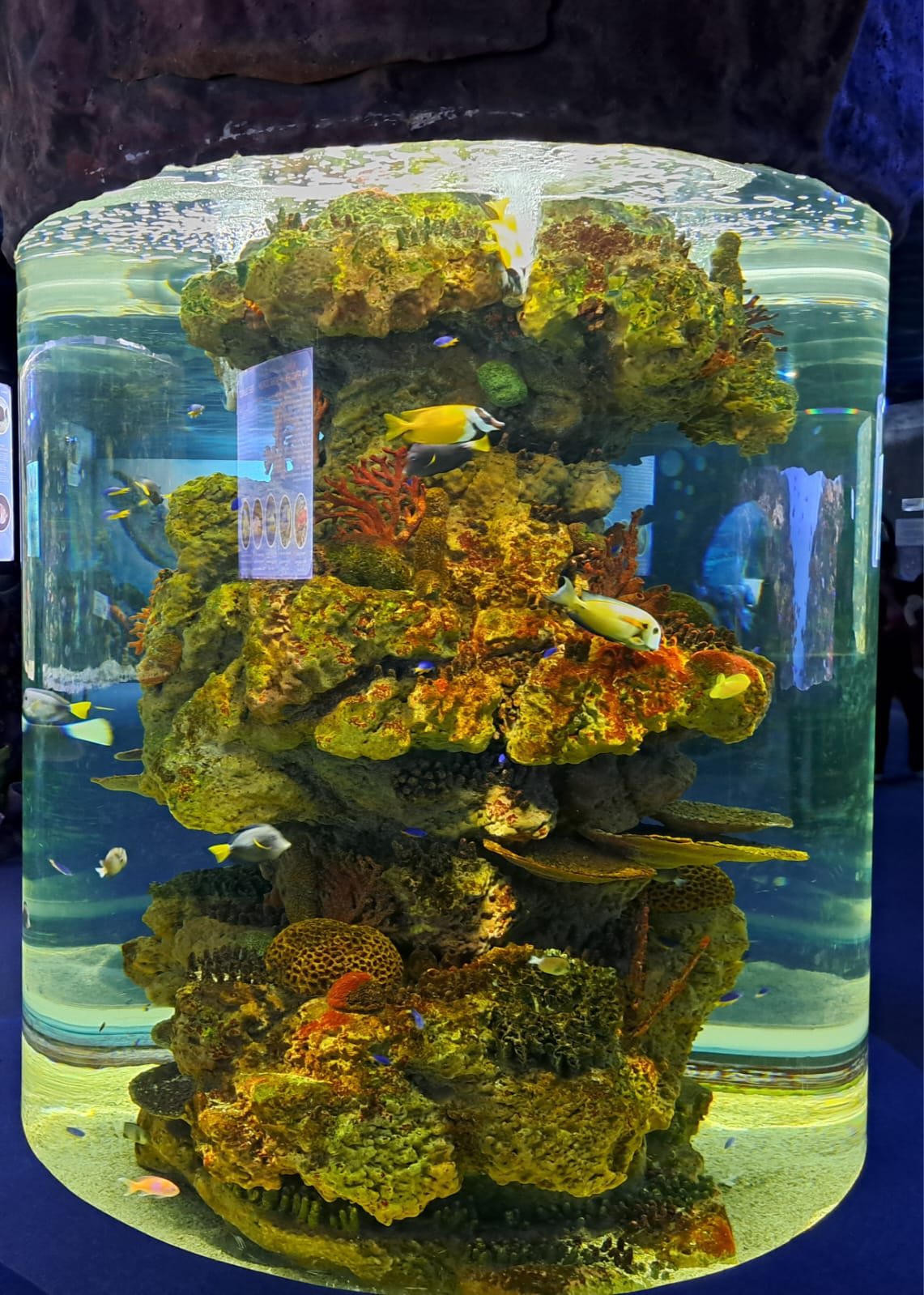 После турникета посетители попадают в зал с приглушённым светом и оформлением в морской тематике. По маршруту размещены аквариумы с обитателями морей и океанов: рыбы, скаты, черепахи, мурены и акулы.
