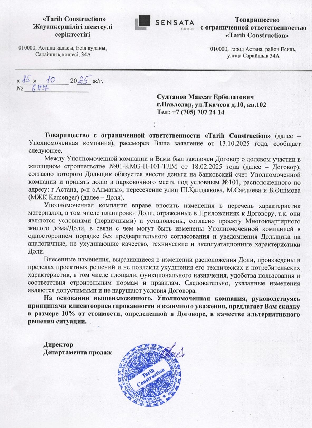 В официальном ответе Sensata Group указано, что в процессе строительства была изменена план-схема, из-за чего изменился номер и расположение парковочного места. Компания утверждает, что имела право вносить такие изменения без предварительного уведомления клиентов и что они «никак не нарушили права покупателей». В качестве компенсации семье предложили 10-процентную скидку на новое место.