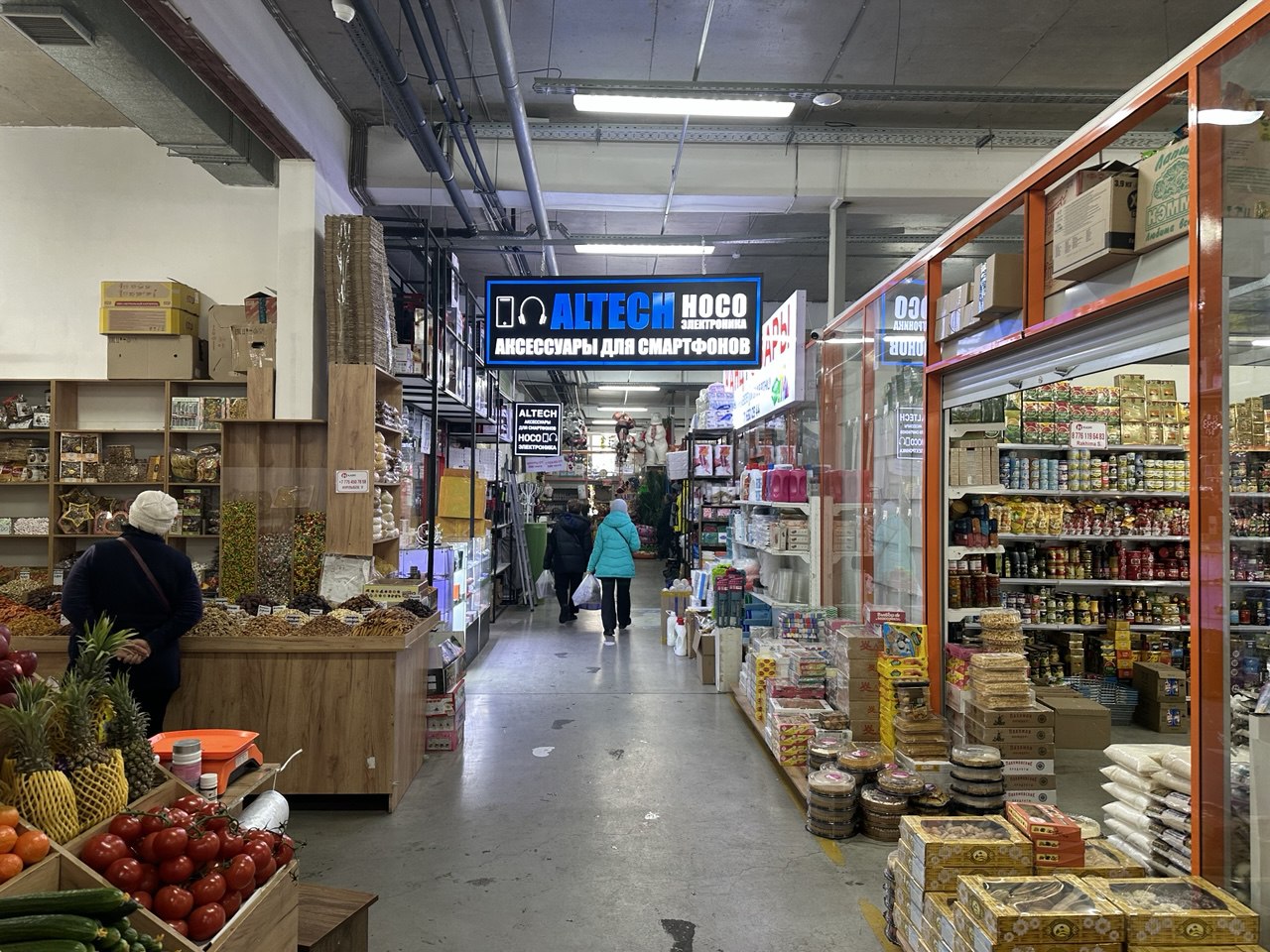 С первых минут в глаза бросается необычное соседство торговых точек. Товары, которые обычно располагаются по категориям, здесь оказались вперемешку. Бутик сотовой связи соседствует с фруктами, мыломойка с коврами, рядом продают цветы и посуду.