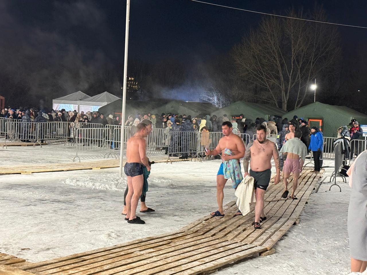 На реке были оборудованы три купели с деревянным настилом. Рядом с каждой из них в целях безопасности дежурили по несколько спасателей. Территория купаний была огорожена: за ограждениями терпеливо ждали своих родственников, знакомых и друзей так называемые группы поддержки, а также прохожие, которые специально останавливались, чтобы посмотреть на тех, кто решился окунуться в ледяную воду в морозную погоду.
