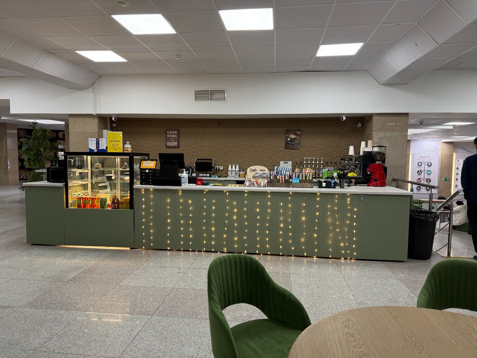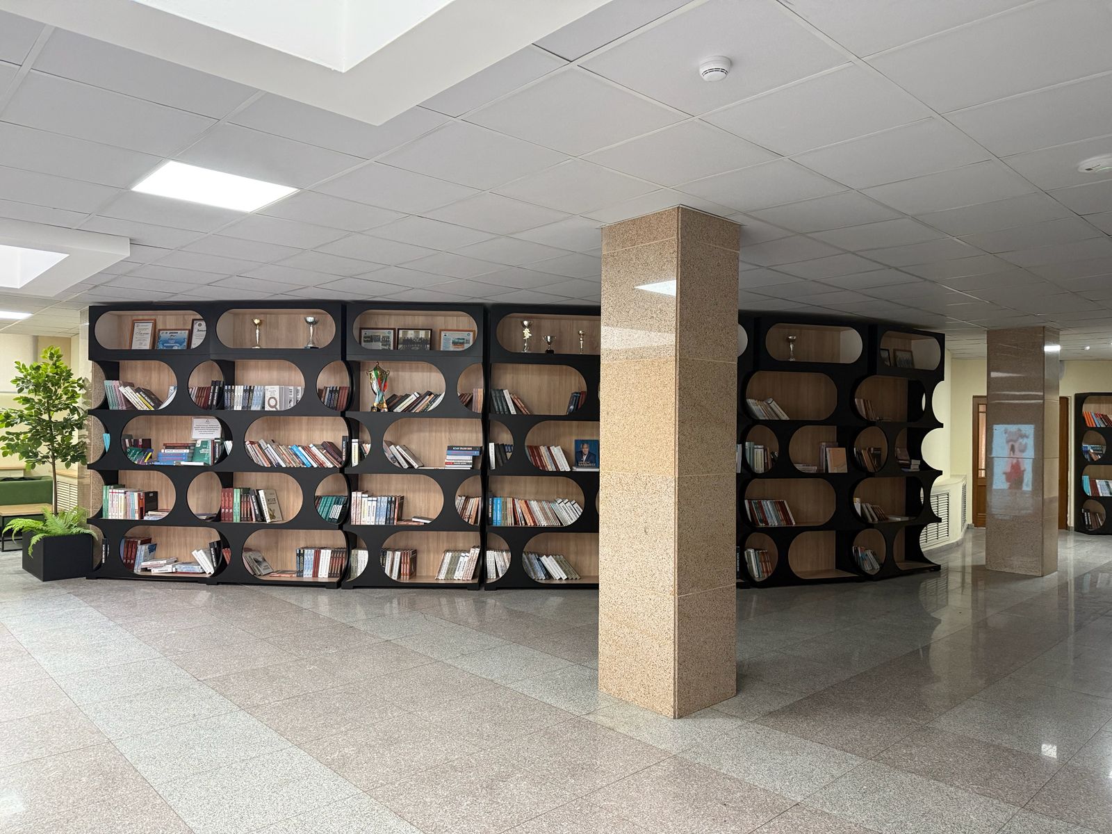 На первом этаже размещены книжные стеллажи, оборудованы зоны отдыха для студентов и работает мини-кофейня, где можно купить напитки и перекусы. Цены — на уровне средних по городу. Здесь же находится актовый зал.