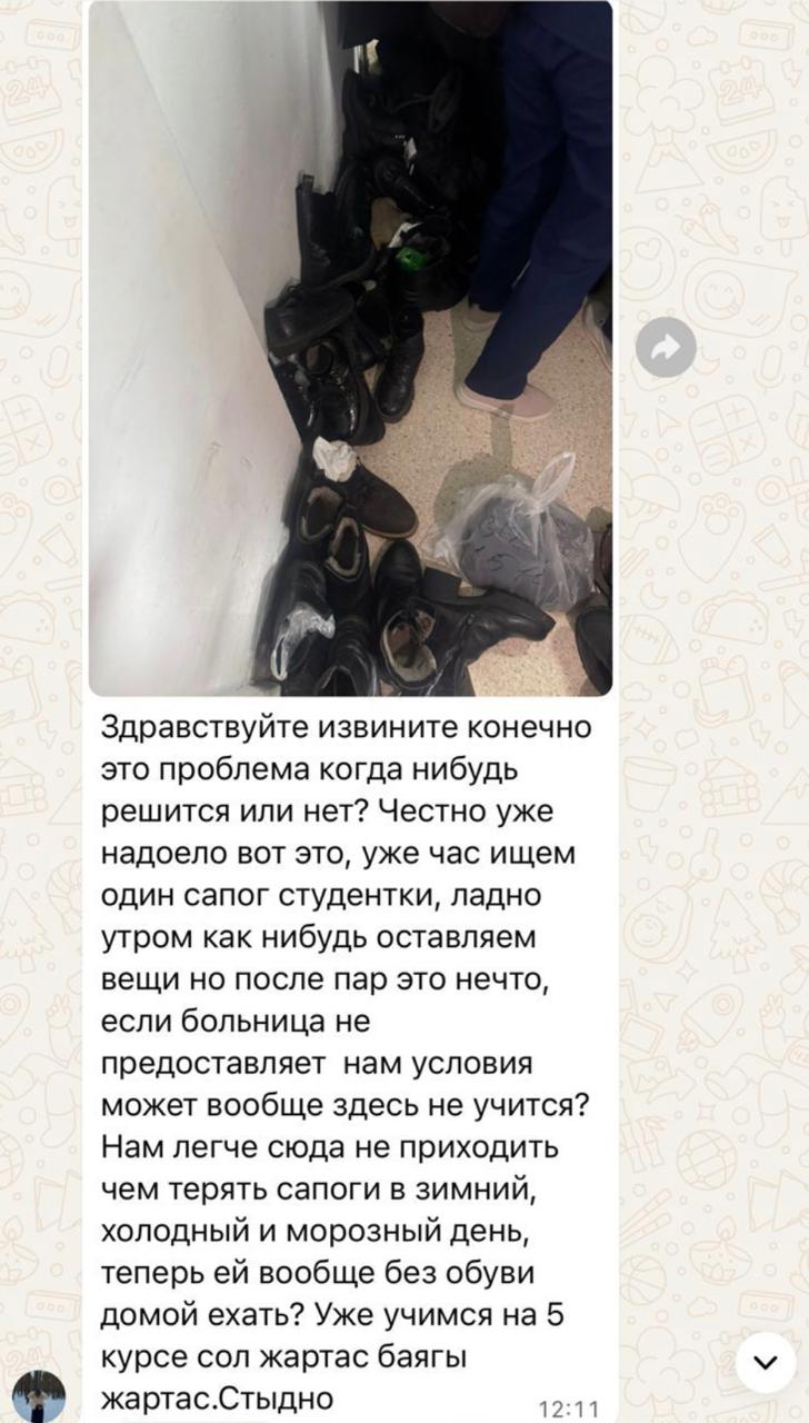 В третьей городской больнице на улице Молдогалова, 28 гардеробов нет вообще. Мы часто надеваем хирургическую форму ещё дома и сразу идём к пациентам — это противоречит санитарным нормам. Для XXI века такие условия недопустимы. Особенно возмущаются студенты-платники, которые платят за обучение около 1,9 млн тенге в год», — говорит студент Меирболат.
