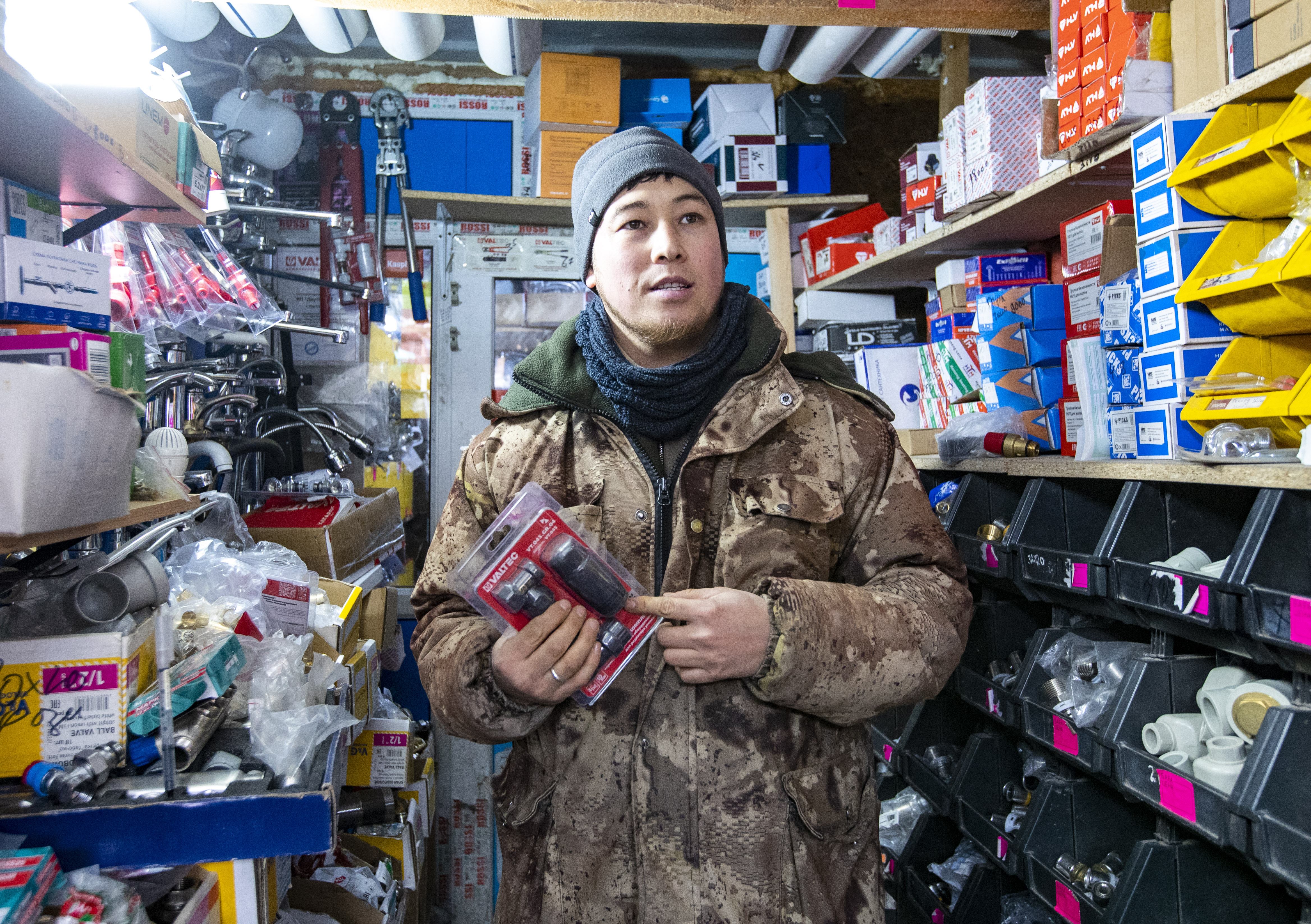 «Это адаптер, а здесь — муфты и переходники. Формально они похожи, но это продукция разных производителей. Вот, например, фирма Valtec. Это российский бренд, но изделия выпускаются в Китае по лицензии. На сегодня это один из наиболее качественных и при этом доступных материалов в сантехнических работах. Я получаю их с двадцатипроцентной скидкой, потому что работаю с поставщиком по договору и на определённых условиях. Для меня это очень выгодно. У других продавцов на рынке этот же товар тоже есть, но уже по более высокой цене», — рассказывает Аяз.