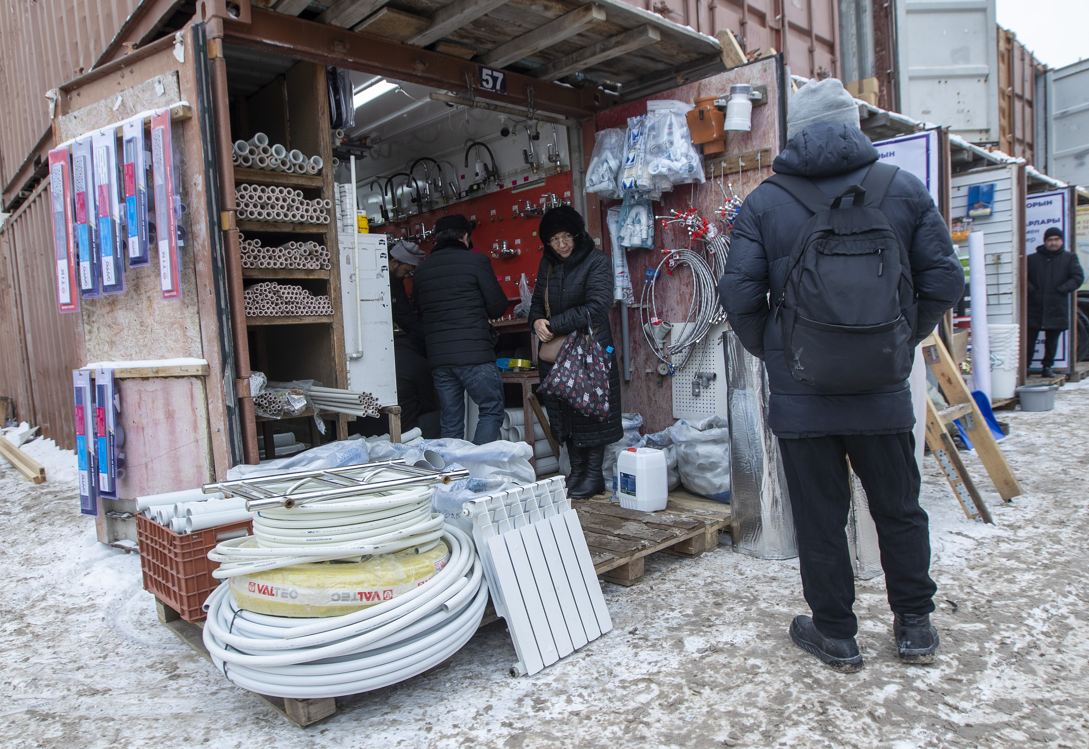 В основном на прилавках представлена продукция китайского производства, которая поступает через Алматы. Доставкой занимаются как крупные компании, так и частники. При этом, по словам продавца, на рынке можно найти и качественные материалы отечественного производства — металлопластиковые фитинги, резьбовые соединения различной конфигурации и трубы казахстанской компании Jakko.
