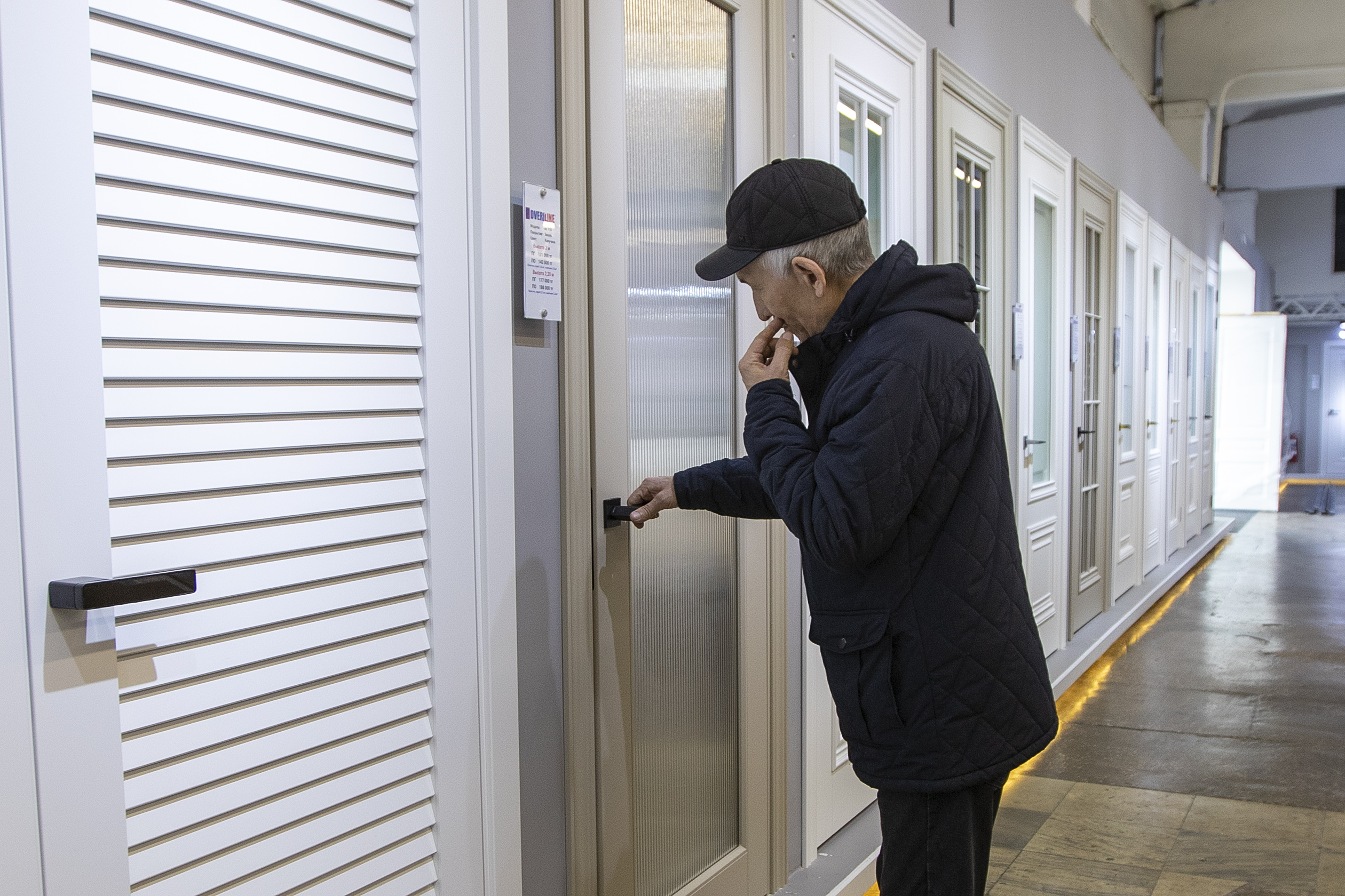 «Это эмалированные двери. Здесь пять слоёв покрытия, есть также четыре, три и два слоя. Цена зависит не только от количества слоёв, но и от породы дерева — от этого формируется категория стоимости. У нас всё просто: двери всегда продаются комплектом. Есть глухие полотна, есть остеклённые, и для каждой высоты предусмотрена своя цена. Основные размеры — 2 метра, 2,20 и 2,30. Сейчас на рынке есть тенденция на двери высотой 2,20 и выше. Всё, что больше, уже изготавливается под заказ, потому что чем выше дверь, тем дороже материал и, соответственно, сама дверь», — поясняет Ануар.