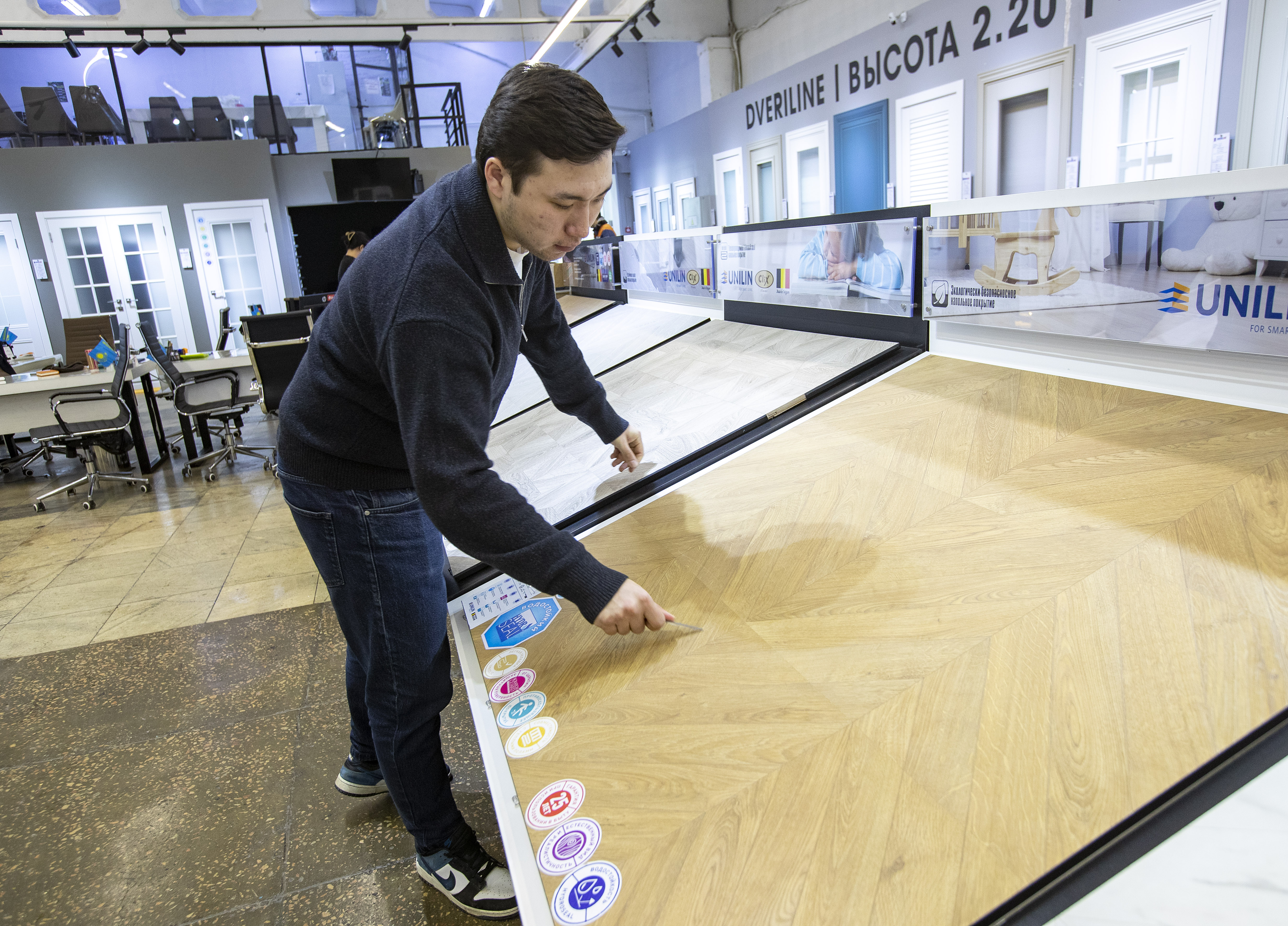 «Водостойкость — очень важная характеристика. Китайский ламинат, как правило, разбухает. Кроме того, у нас есть антивандальный ламинат. Его сложно поцарапать — например, при передвижении мебели. На обычных покрытиях могут оставаться трещины или царапины, а здесь этого не происходит», — говорит Ануар и предлагает нам выбрать любое напольное покрытие.