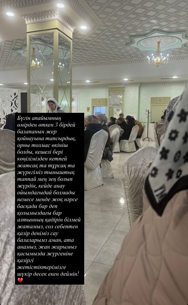 «Сегодня похоронили троих детей моей сестры. Со дня трагедии не находим себе место. Иногда мы просим слишком многое и не ценим то, что есть. Нужно ценить здоровье детей, родителей и близких. Довольствоваться тем, что есть», – обратилась к казахстанцам родная тетя погибших детей.