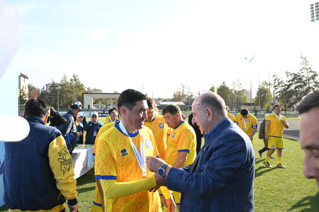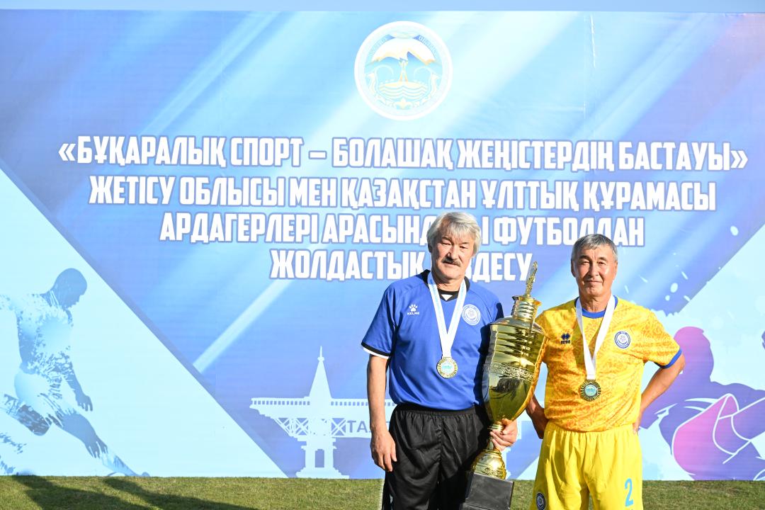 После этого спортсмены-ветераны вышли на футбольное поле в составе национальной сборной Казахстана и сборной любительских команд Жетісу.