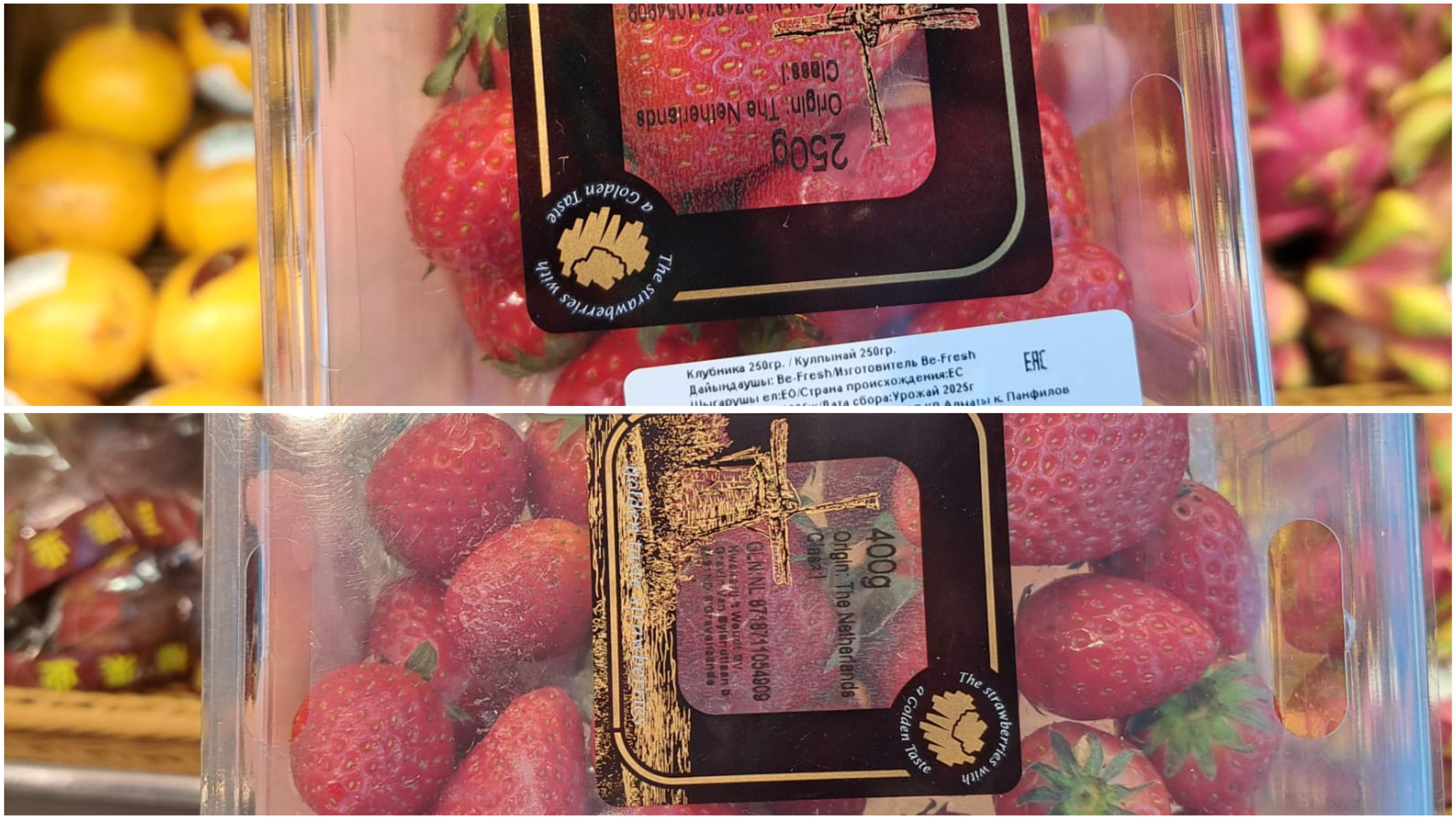 Стоимость 250 граммов — 5825 тенге, 400 граммов — 8310 тенге. На упаковке указан производитель — ЕС, однако точная страна происхождения не обозначена. По словам продавца, клубника действительно поставляется из Европы, а импортирует её компания из Алматы.