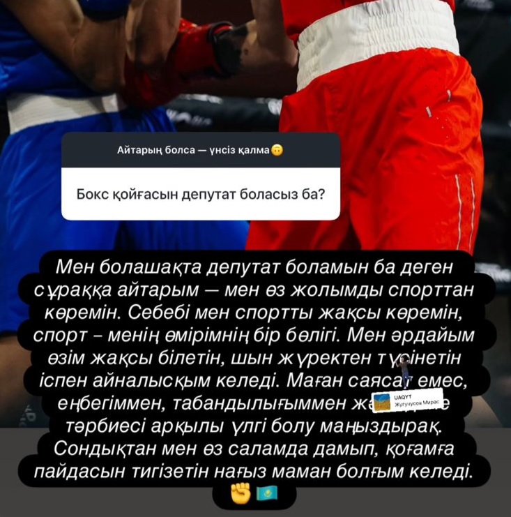 В в Instagram подписчики спросили Назым Кызайбай, хочет ли она в будущем стать депутатом. Спортсменка дала четкий ответ: