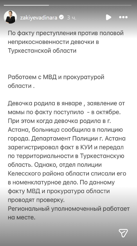 «По факту преступления против половой неприкосновенности девочки в Туркестанской области: работаем с МВД и прокуратурой области», — рассказала детский омбудсмен.