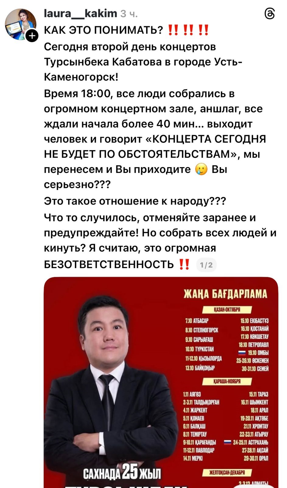 В Усть-Каменогорске концерт Турсынбека Кабатова был отменен после почти 40 минут ожидания зрителей в переполненном зале, передает ИА «NewTimes.kz».