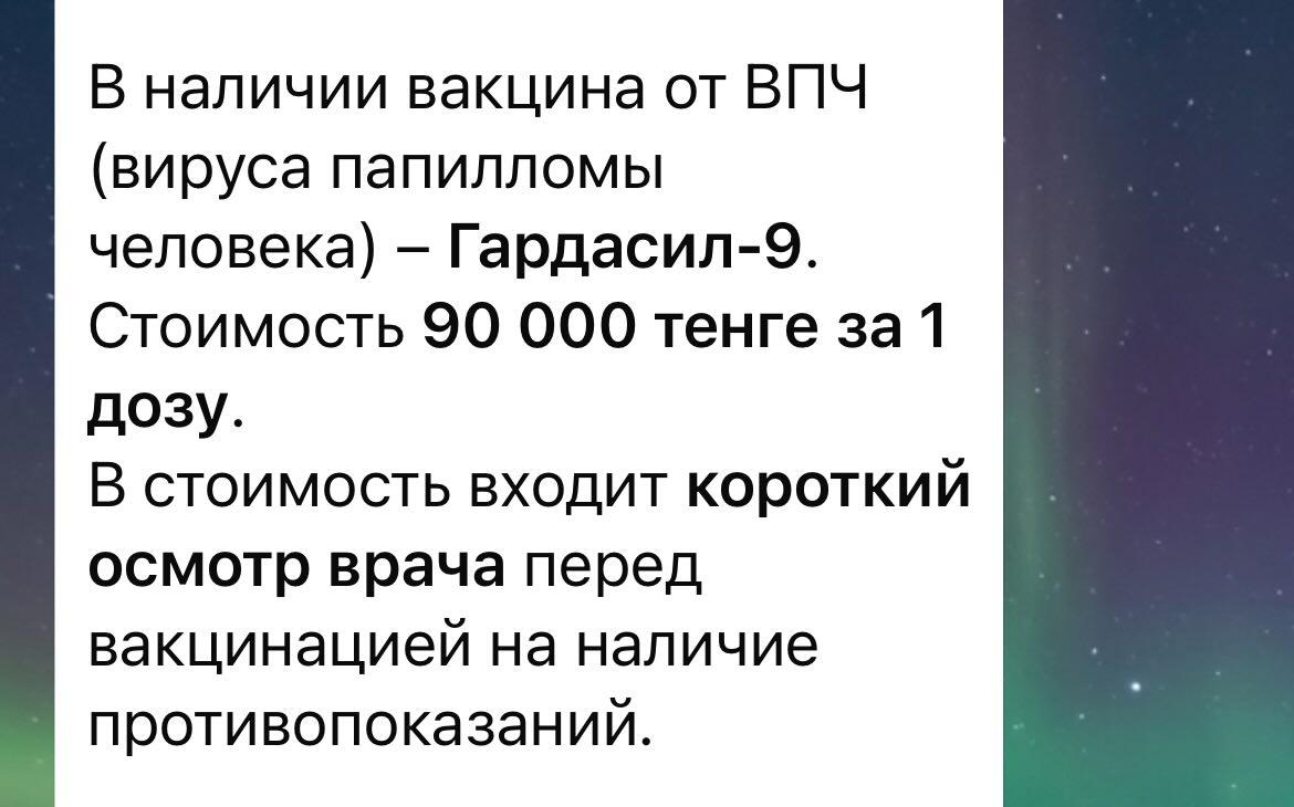 По словам казахстанки, такая стоимость для нее слишком высока, учитывая, что вакцинацию необходимо пройти трижды, что в сумме составляет 180 000 тенге. В эту цену также входит короткий осмотр врача перед процедурой для проверки наличия противопоказаний.