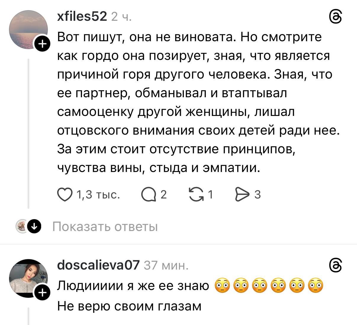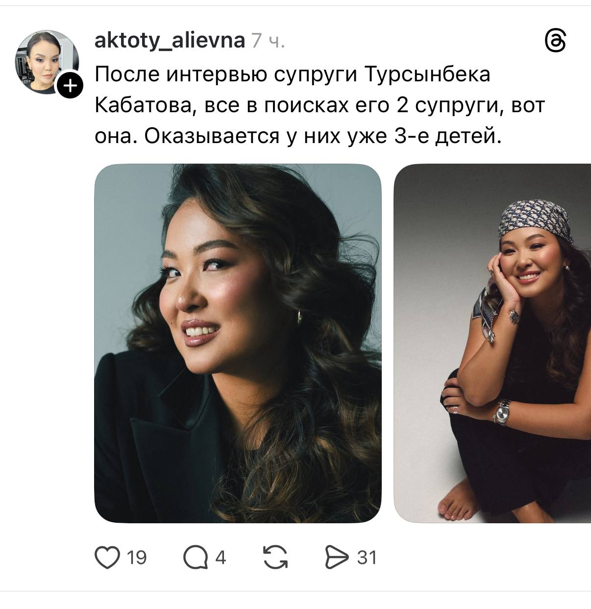 Также в соцсети Threads распространились фото женщины, которую пользователи называют второй женой известного казахстанского юмориста Турсынбека Кабатова. Посты с ее снимками быстро набрают популярность, вызвав бурные споры в сети. По данным пользователей, у женщины закрытый аккаунт, на который подписано 51 человек. В биографии профиля указано: «Замужем, мама троих детей». Как утверждают в обсуждениях, она родила Кабатову троих детей — сына и двух дочерей. Пользователи отметили, что на ее закрытый аккаунт якобы подписан сам Турсынбек Кабатов.