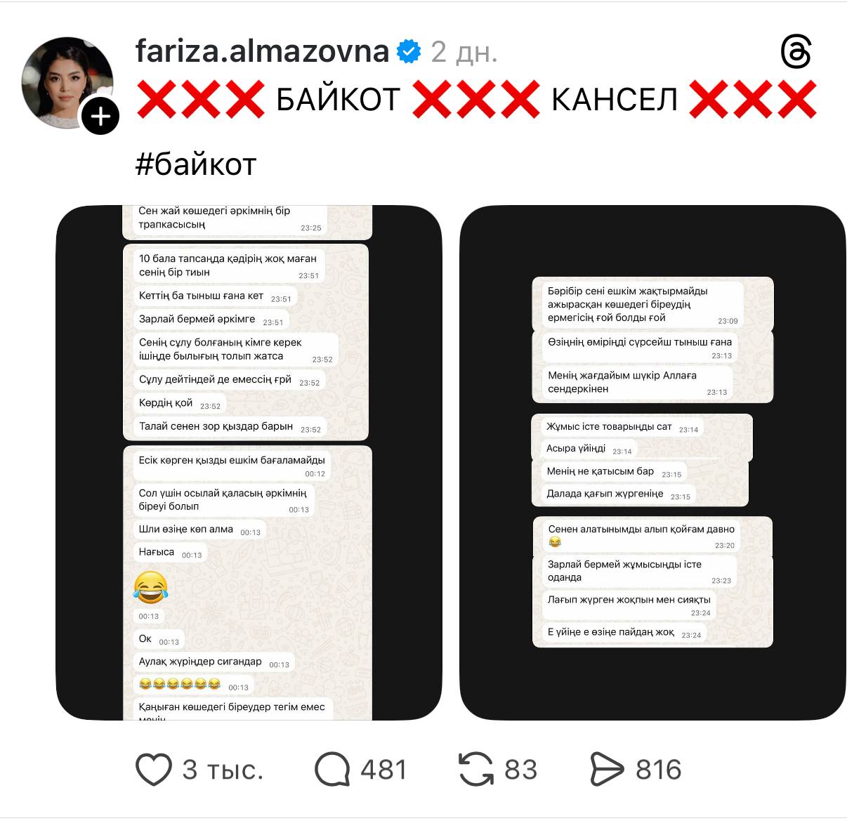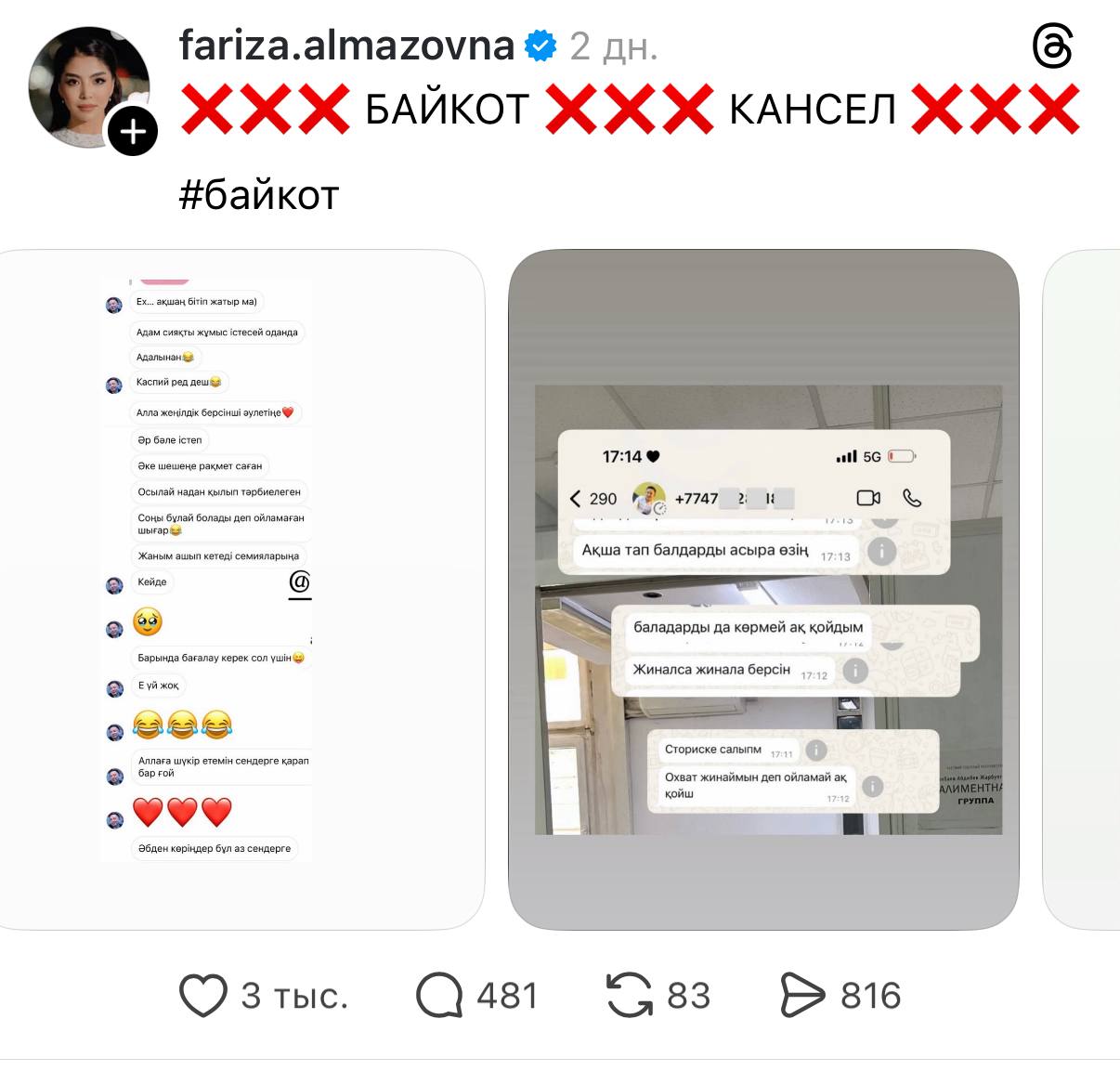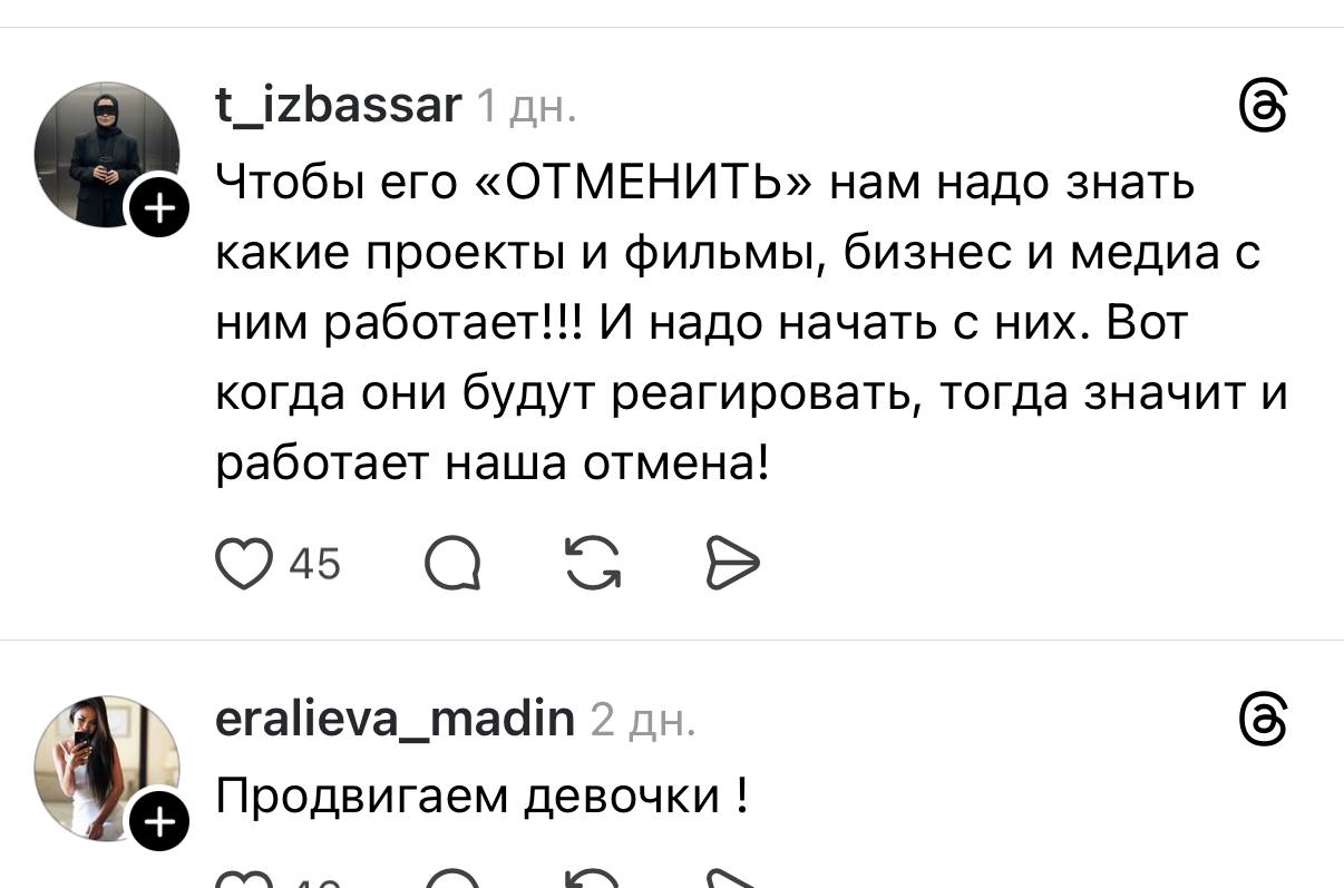 Жена блогера Нурсултана Жаксыген (@zhaksygen_n) Фариза Алмазовна в Threads объявила бойкот своему мужу, опубликовав переписки, в которых он оскорблял её и детей. В сети разгорелась дискуссия о «отмене» блогера и актера, передает ИА «NewTimes.kz».