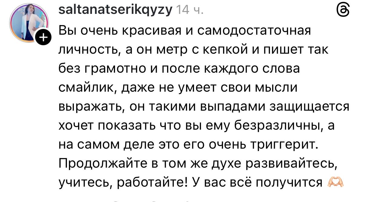 «Вы очень красивая и самодостаточная личность, а он метр с кепкой и пишет без грамотно, даже после каждого слова смайлик. Он такими выпадками защищается, хочет показать, что вы ему безразличны, а на самом деле это его очень триггерит»,