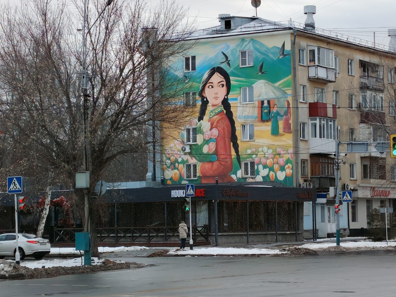 Например, на проспекте Ауэзова появилась композиция с казахской девушкой в национальной одежде на фоне степи и тюльпанов. Этот мурал стал одним из любимых у горожан.