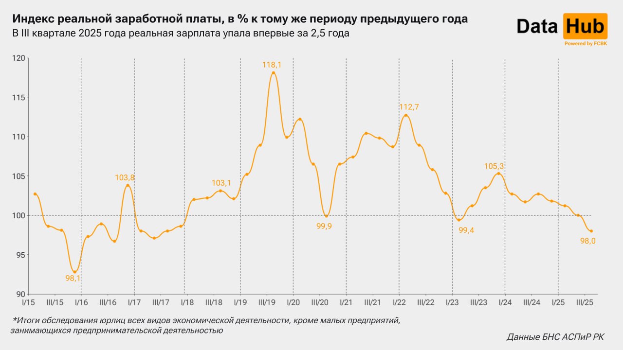 По данным на третий квартал 2025 года, средняя зарплата составила 429,4 тыс. тенге. Это на 10% больше, чем годом ранее. Однако с учетом инфляции реальный доход снизился на 2%. Другими словами, формально денег стало больше, но купить на них можно меньше.