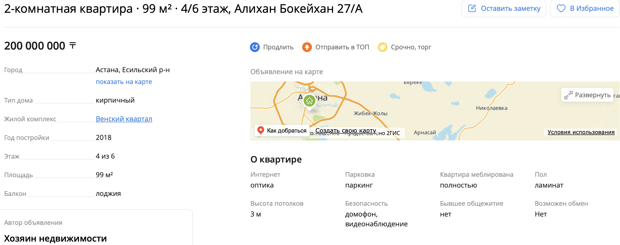 Площадь жилья составляет 99 квадратных метров, квартира расположена на 4 этаже. Квартира продаётся с мебелью и бытовой техникой, владелец предлагает её без участия риелторов. Фотографии в объявлении отсутствуют.
