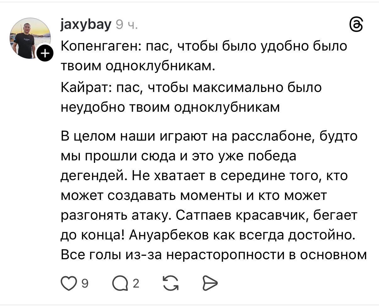 В Threads казахстанские болельщики восхищались забитыми голами Дастана Сатпаева и Олжаса Байбека, отмечая, что они были историческими для Казахстана, а также благодарили за эмоции, которые им подарили соотечественники во время игры.