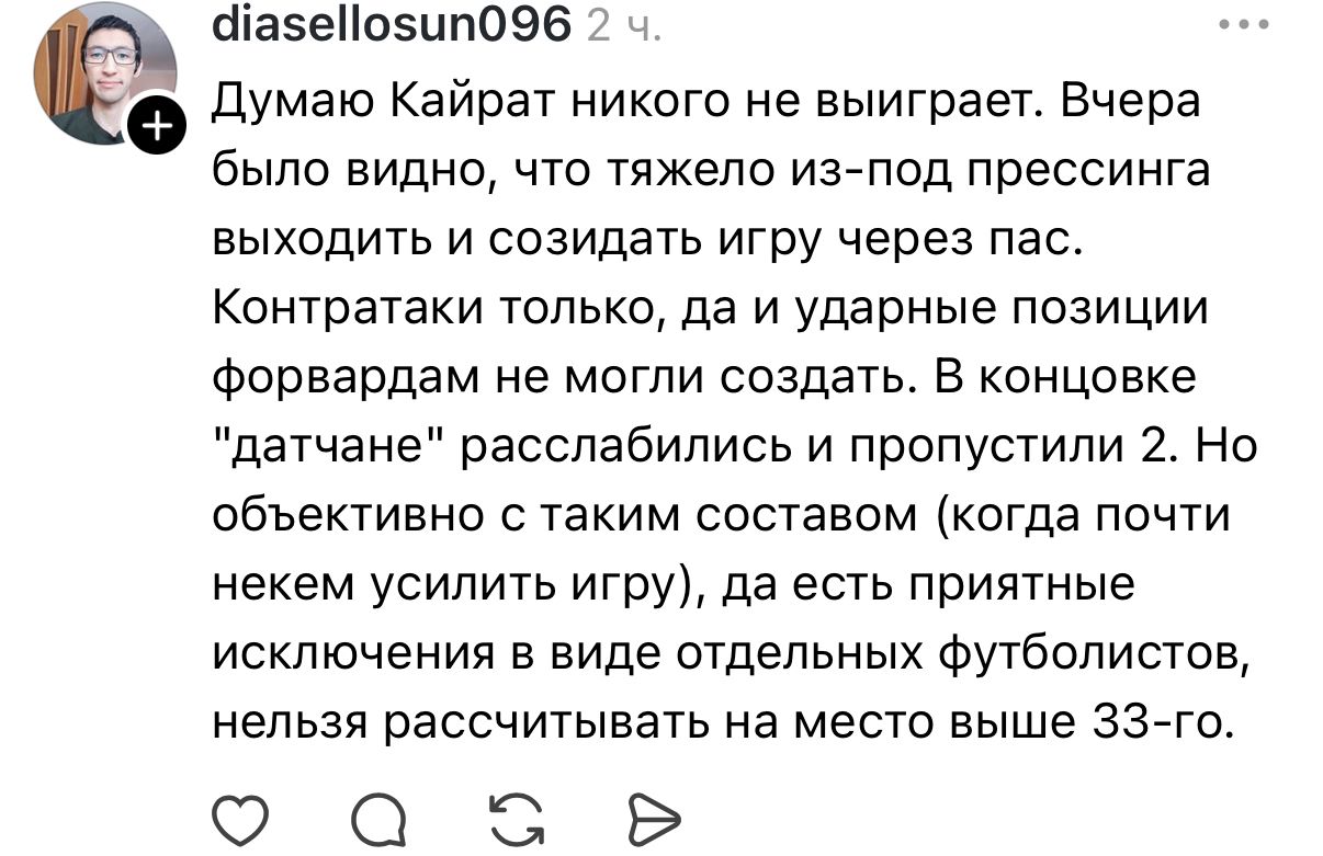 «Сегодня в 00:12 купила билет и уже в 3 часа ночи вылетела в Копенгаген из Дубая. Хотелось бы поболеть за наших вместе со всеми, но, увы, на эту зону билеты вообще не продавались. Кайрат сегодня сыграл так себе… Было ощущение, будто команда даже не пыталась забивать. Просто я привыкла к матчам крупных клубов. Кайрат, алға!»,— пишут пользователи.
