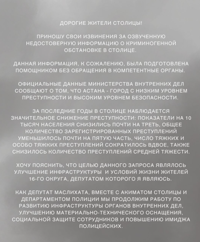 «Приношу свои извинения за озвученную недостоверную информацию о криминогенной обстановке в столице. Данная информация, к сожалению, была подготовлена помощником без обращения в компетентные органы. Официальные данные Министерства внутренних дел сообщают о том, что Астана - город с низким уровнем преступности и высоким уровнем безопасности», — написал Талгат Ергалиев.