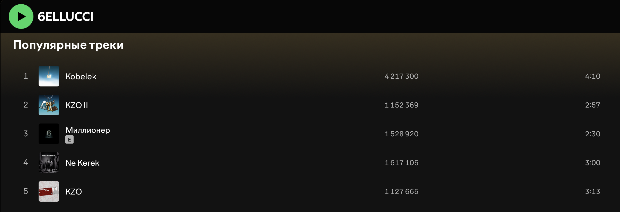 6ELLUCCI — казахстанская хип-хоп-группа, получившая широкую известность благодаря треку KZO, посвящённому родному для музыкантов городу Кызылорда. Композиция быстро стала вирусной и закрепила за дуэтом статус одного из самых заметных проектов на современной сцене.