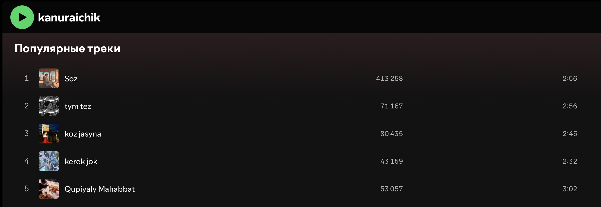 kanuraichik — молодая певица из Западного Казахстана, чьё творчество привлекает внимание искренностью и тонкой эмоциональностью. Её мягкий, камерный вокал создаёт ощущение личного разговора со слушателем, а песни строятся на простых, но точных чувствах.