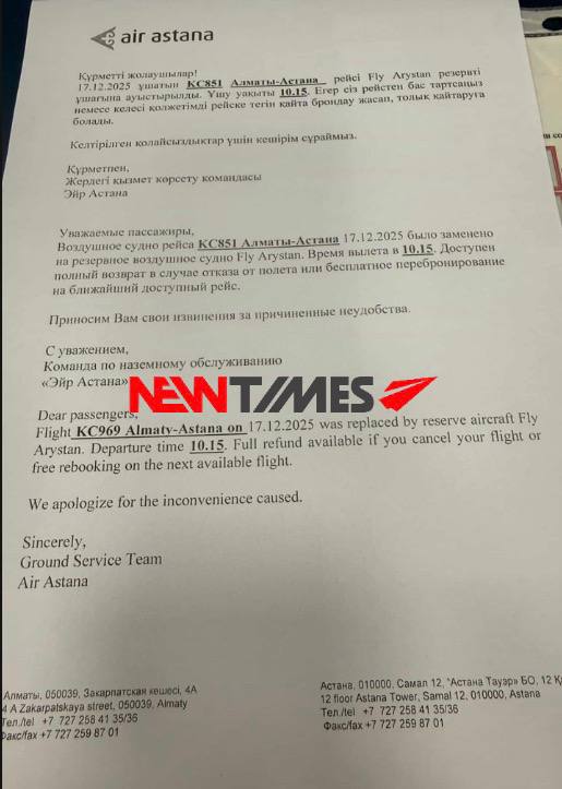 «Вылет в Астану будет выполнен на другом воздушном судне в 10:15. По данному инциденту проводится установленная процедура технической проверки», — говорится в сообщении.
