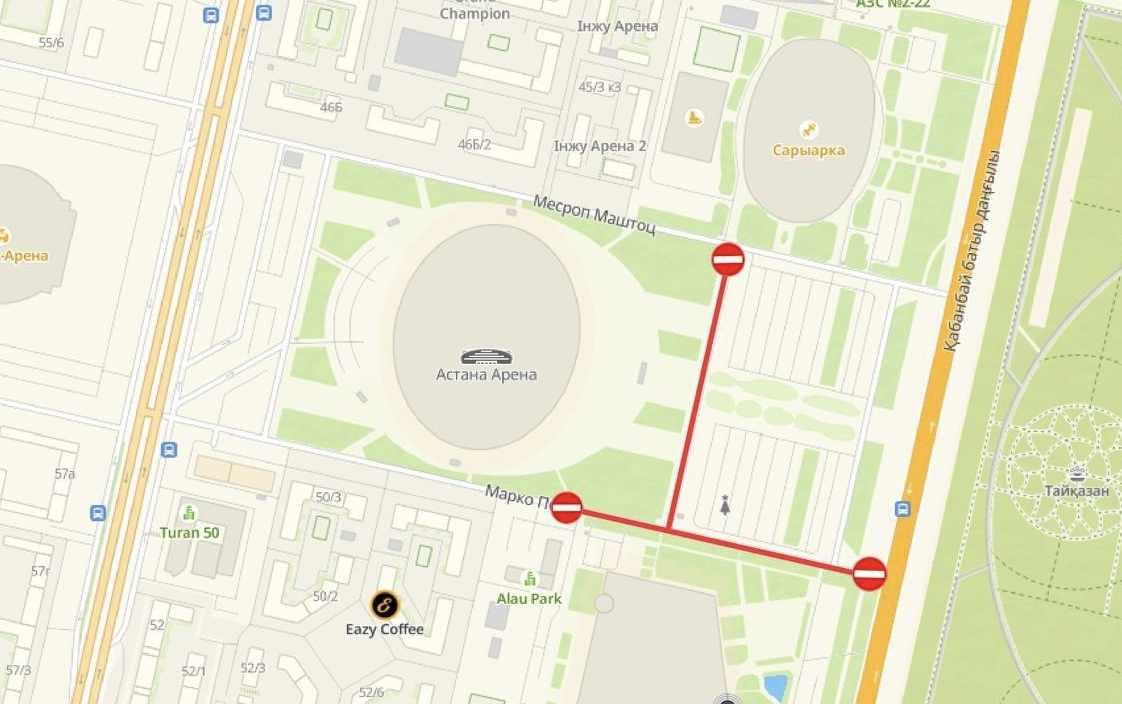 С 17:30 рядом со стадионом Astana Arena начнётся концерт, интерактивы для детей и дрон-шоу. Из-за этого временно перекроют улицы Марко и Месропа Маштоца, а также дороги рядом с ледовым дворцом «Алау» и вдоль восточной стороны стадиона. Водителей просят заранее планировать маршруты.