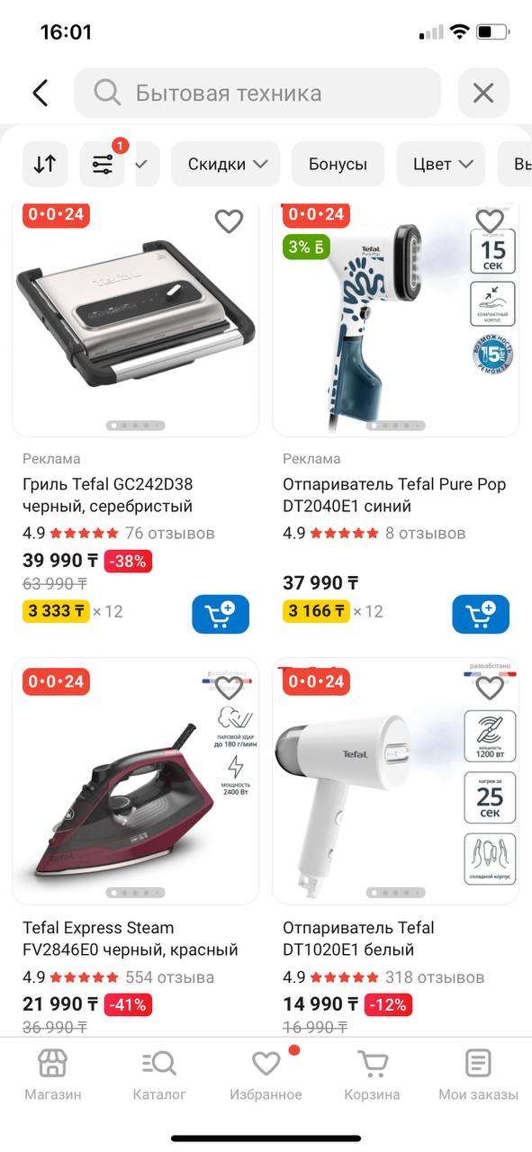 У Tefal скидки заметнее, особенно на утюги и грили – до –38-41%. Но разброс большой: рядом стоят модели с –12-15%. Поэтому ориентироваться на «до –40%» в целом по бренду бессмысленно – лучше смотреть конкретный товар и его график цены.