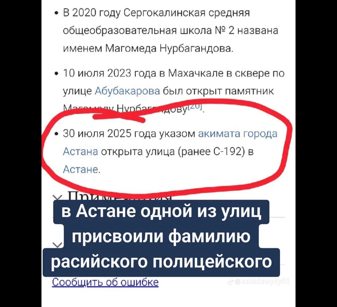 Казахстанский блогер Диас Кузайыр опубликовал ветку в Threads, где сообщил о присвоении одной из улиц Астаны имени российского полицейского Магомеда Нурбагандова, трагически погибшего почти десять лет назад от рук боевиков. По его словам, такое решение со стороны властей выглядит неуместным, поскольку Нурбагандов не имеет никакого отношения к Казахстану и Астане, хотя совершил подвиг в России.