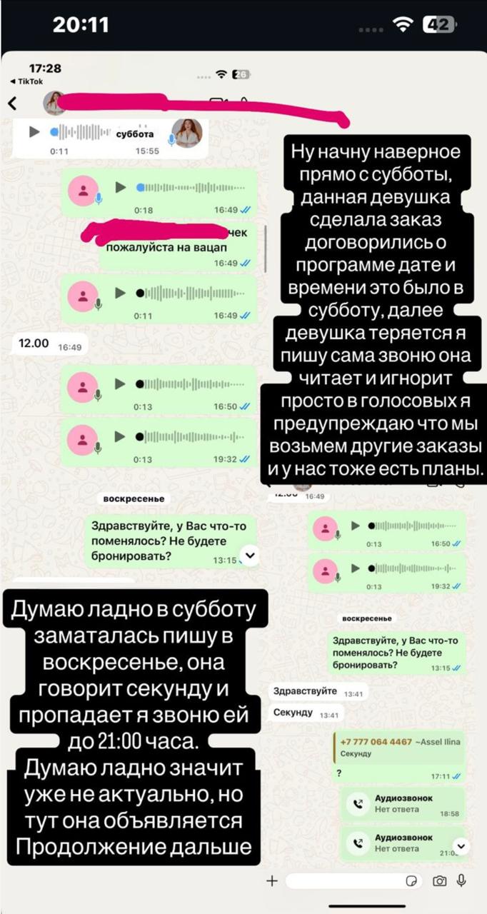 По словам организаторов, они заранее переписывались с Асель, которая изначально указала дату утренника на 12:00 и утвердила программу. Однако позже она перестала выходить на связь. Организаторы отмечают, что почти до самого конца пытались с ней связаться, после чего Асель вновь появилась и изменила время мероприятия.