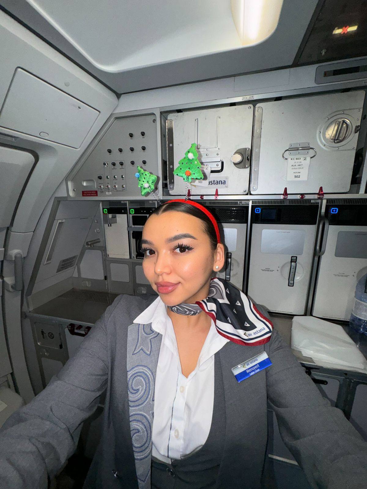 «Это был ночной рейс. Командир объявил, что наступил Новый год, поздравил пассажиров. Я впервые встречала праздник в небе — ощущения были странные, но интересные. С нами ехала большая компания: они открывали шампанское и явно отлично проводили время.», — рассказывает Меруерт.
