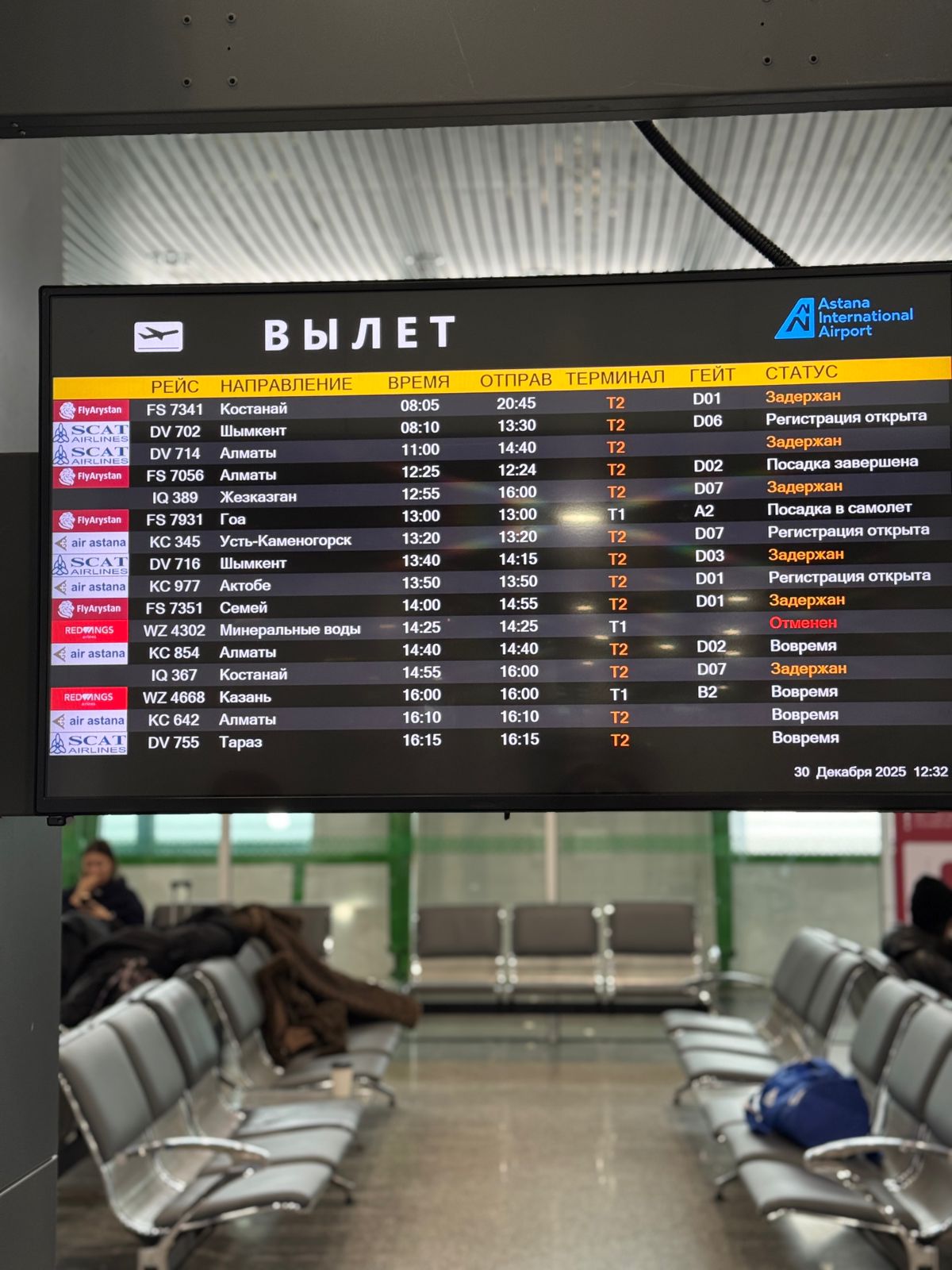 По словам девушки по имени Айжан, которая должна была вылететь утром из Астаны в Петропавловск, неудобства в аэропорту начались ещё с самого утра из‑за невозможности зарегистрироваться на рейс онлайн. Вылет до сих пор не состоялся из‑за неблагоприятных погодных условий.