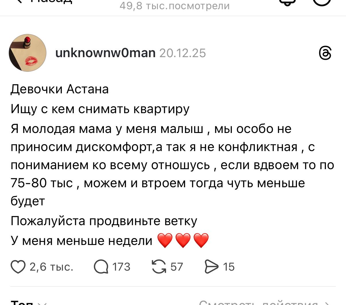 В Threads астанчане стали чаще публиковать объявления в формате «ищу соседа» или «подселение». Люди пишут о бюджете, количестве жильцов и условиях проживания, пытаясь сделать аренду хотя бы частично доступной.