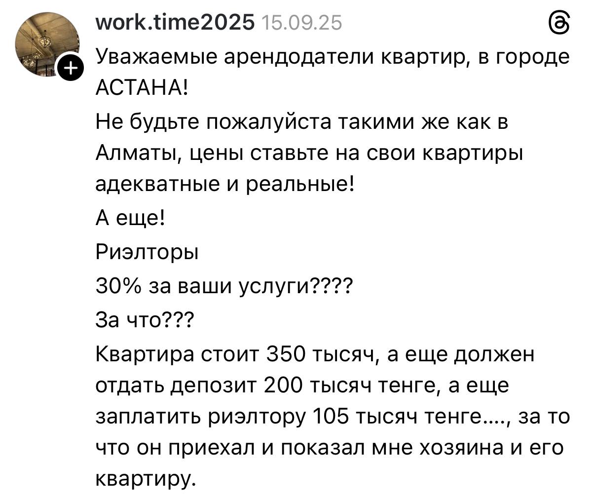 В Threads резко выросло число объявлений с предложениями совместной аренды жилья. Горожане признаются, что в одиночку снимать квартиру становится не по карману, поэтому люди объединяются, делят расходы или временно переезжают к родственникам, передает ИА «NewTimes.kz».