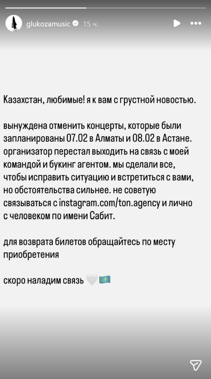 По словам артистки, выступления были запланированы на 7 февраля в Алматы и 8 февраля в Астане, однако организатор перестал выходить на связь с её командой и букинг-агентом. Глюкоза отметила, что они пытались решить ситуацию и сохранить встречи с поклонниками, но обстоятельства оказались сильнее.