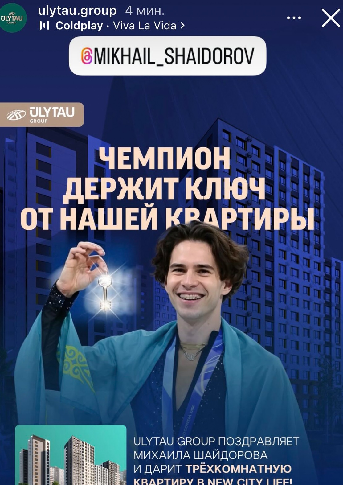 Казахстанская строительная компания Ulytau Group сообщила о намерении подарить Михаилу Шайдорову трёхкомнатную квартиру в жилом комплексе New City Life, передает ИА «NewTimes.kz».