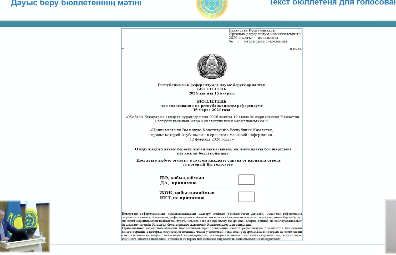 В Астане на заседании комиссии по конституционной реформе, назначенного на 15 марта, впервые публично продемонстрировали образец бюллетеня для голосования, передает ИА «NewTimes.kz».