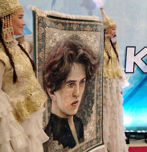 В продолжение торжественной встречи в Алматы фигуристу вручили ковер с его портретом.