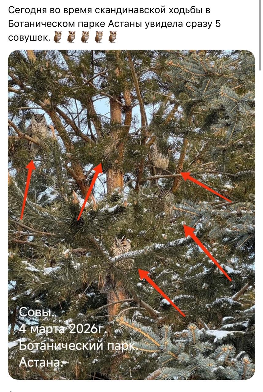Необычным снимком в Threads поделилась жительница Астаны по имени Ирина. По её словам, семейство сов она заметила во время скандинавской ходьбы в Ботаническом саду.