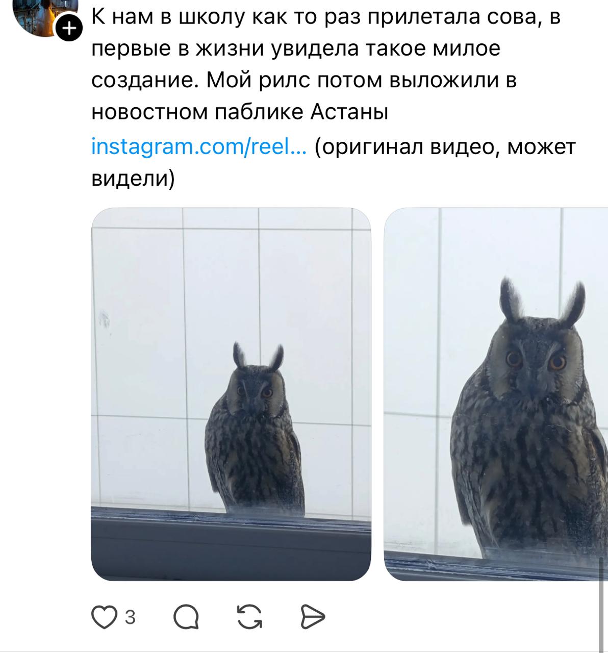 В комментариях под постом астанчане восхитились этим природным явлением: одни шутили, другие делились похожими снимками сов и других птиц. Многие также отмечали, что тоже видели сов в городе, однако чаще всего они появляются ночью.