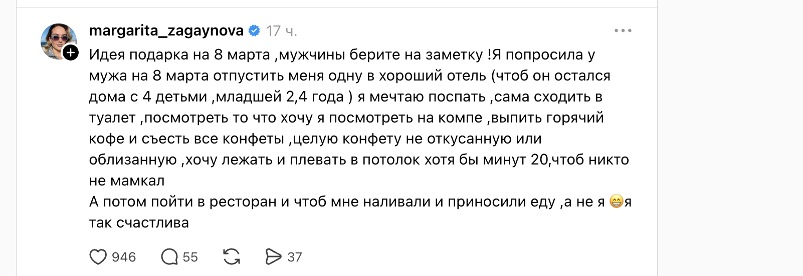 Даже «день в одиночестве» стал ценным подарком. Одна из подписчиц рассказала, что на День святого Валентина муж забрал детей на весь день, а вечером вернулся с цветами и сладостями.