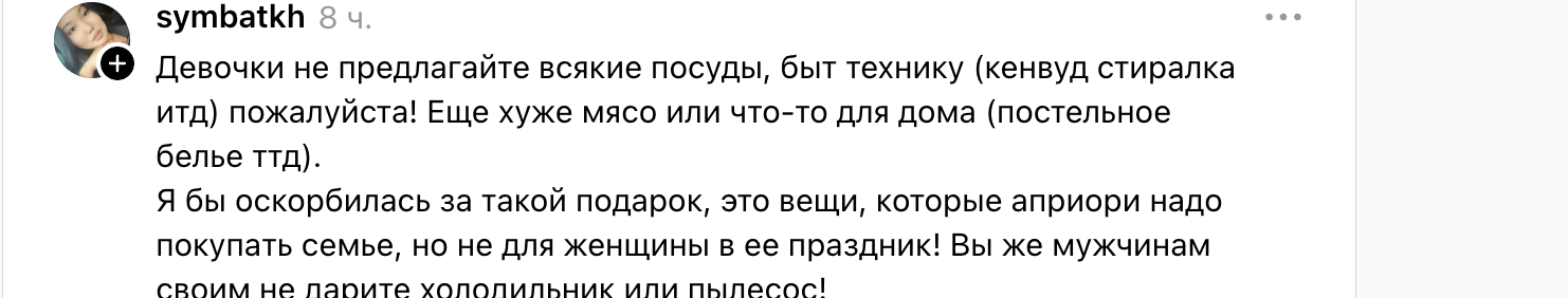 «Не предлагайте посуду и бытовую технику – стиралки, кухонные комбайны. Ещё хуже – мясо или что-то для дома. Я бы оскорбилась. Это вещи, которые покупаются для семьи, а не в подарок женщине на её праздник. Вы же не дарите мужчинам холодильник на 23 февраля».