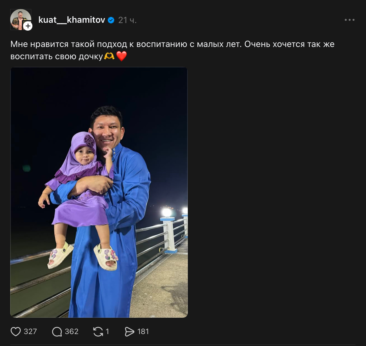 Казахстанский боец Куат Хамитов опубликовал фото с ребенком в хиджабе. В соцсетях пост раскритиковали, передает ИА «NewTimes.kz».