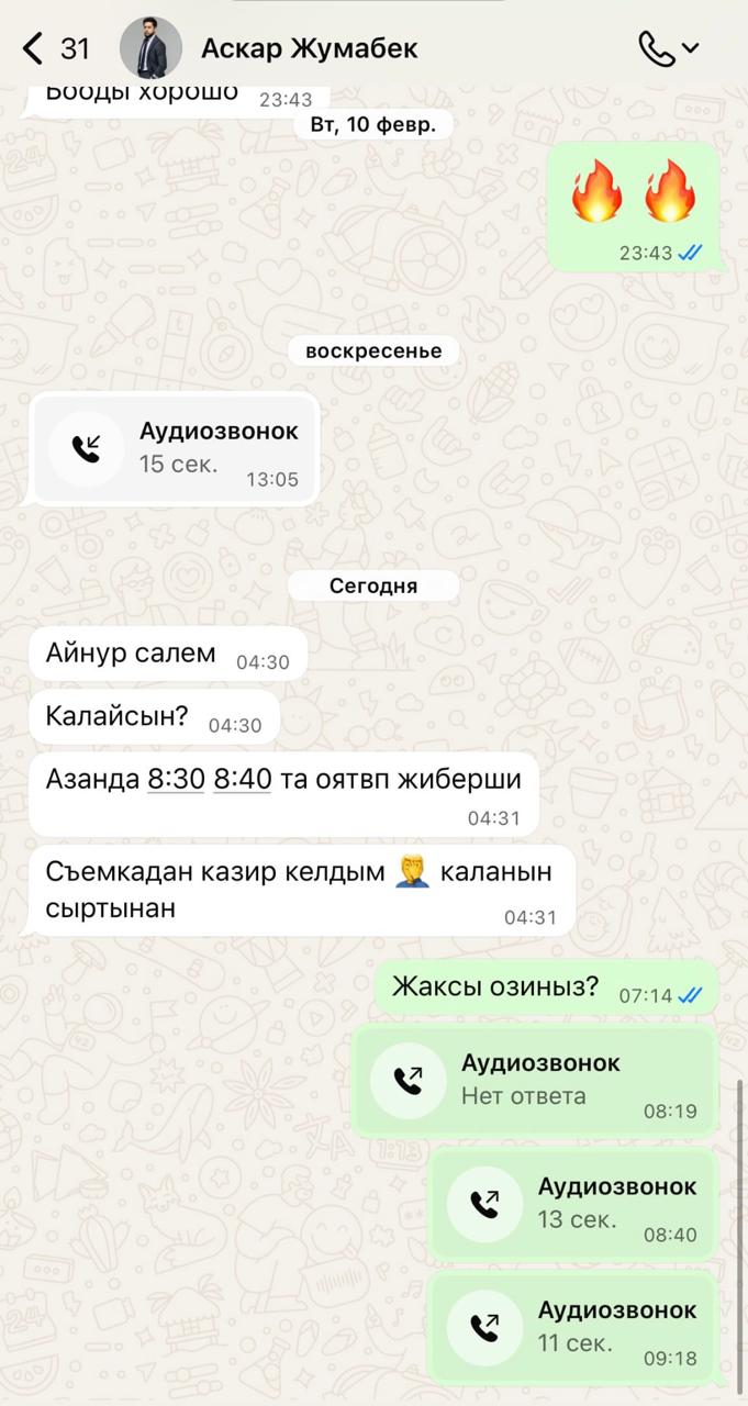 По словам девушки, инцидент произошел утром 20 марта перед съемкой, которая была запланирована на 10:00. Айнур уточнила, что заранее получила от Аскара Жумабека сообщение с просьбой разбудить его, так как он, по ее словам, не раз срывал съемки