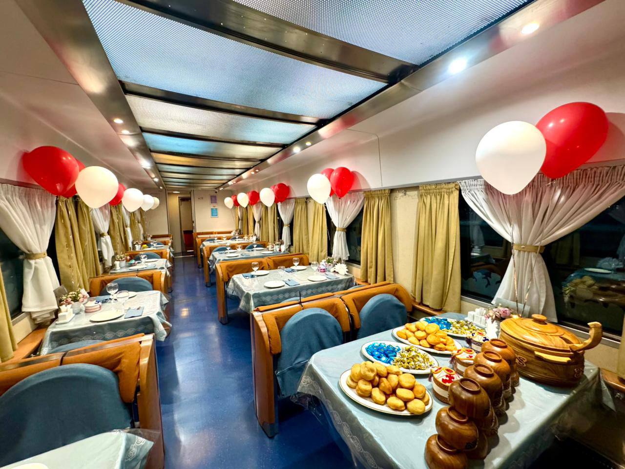 Как сообщает пресс-служба КТЖ, пассажиров встречали на перроне проводники в традиционной национальной одежде. Каждого пассажира угощали национальными блюдами — наурыз-коже и баурсаками.