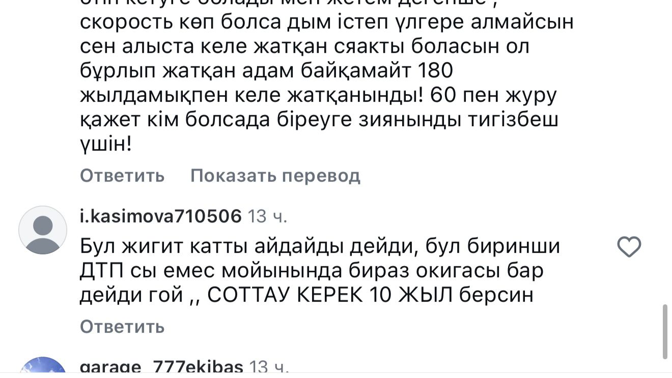 Однако родственники сообщили, что виновник ДТП Алиби Боранбаев имеет статус «свидетеля» и находится на свободе. Водитель автомобиля Lexus — 2002 года рождения. В сети опубликовали скрины с его страницы Instagram, а сам аккаунт закрытый.